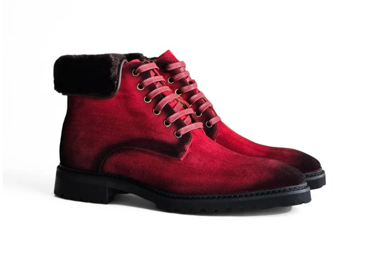 Rugged and Handsome Suede lace-up Boot from the Carrucci collection features a Faux Shearling collar and a Shearling and leather lining, removable cushioned insole, and a full Rubber Outsole!