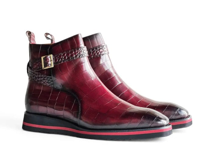Striking Crocodile Embossed full grain Leather slip-on Boot from the Carrucci collection features a side zipper and Cross Strap Detail with Metal Buckle, soft Leather lining, and a Lightweight Rubber Outsole!