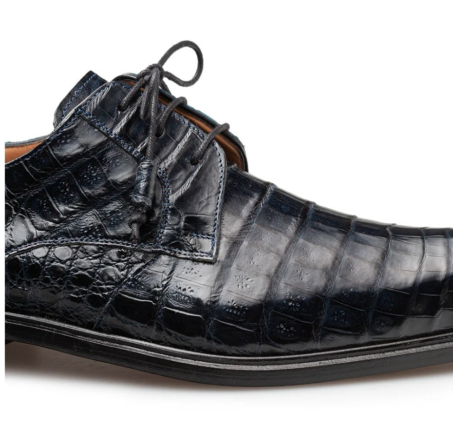 Exotic Blucher lace-up Shoe from the Mezlan collection in Genuine Crocodile features a Plain toe, soft Italian Calfskin lining, their injected memory foam comfort cushion insole, Crocodile wrapped tassel ends, and Durable Full Leather Sole with Artisan top half InlayHandmade in Spain.