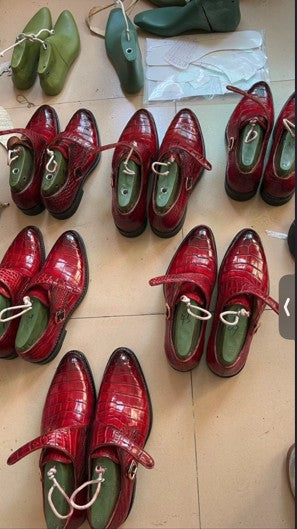 Exclusively for C & E, this Completely Handmade, Hand Burnished Genuine Alligator Monkstrap shoe from our Maurice Custom Made Collection features Handmade Norwegian Welted Construction, Silvertone Buckle, soft Calfskin lining, a clean welt and a full Leather sole! Matching Belt Sold Separately. Available by Special Order Only in Black, Brown, Burgundy, Tan, Grey, Navy, Sport, Green, Purple & Cognac. ONCE ORDERED, THE SHOES WILL BE SHIPPED IN 3-4 WEEKS. Special Orders are not Refundable. Exchange only within 14 Days.