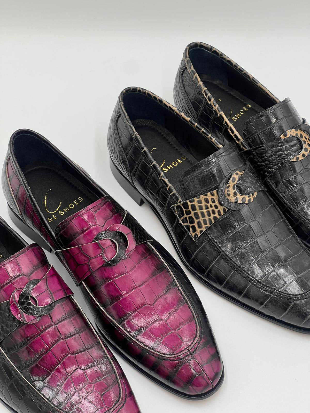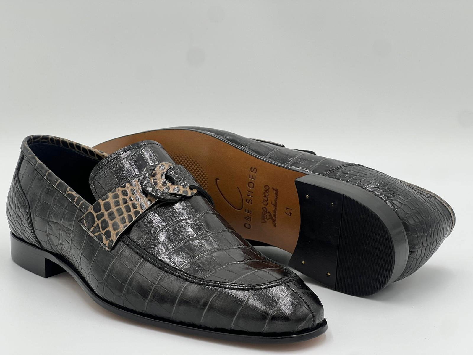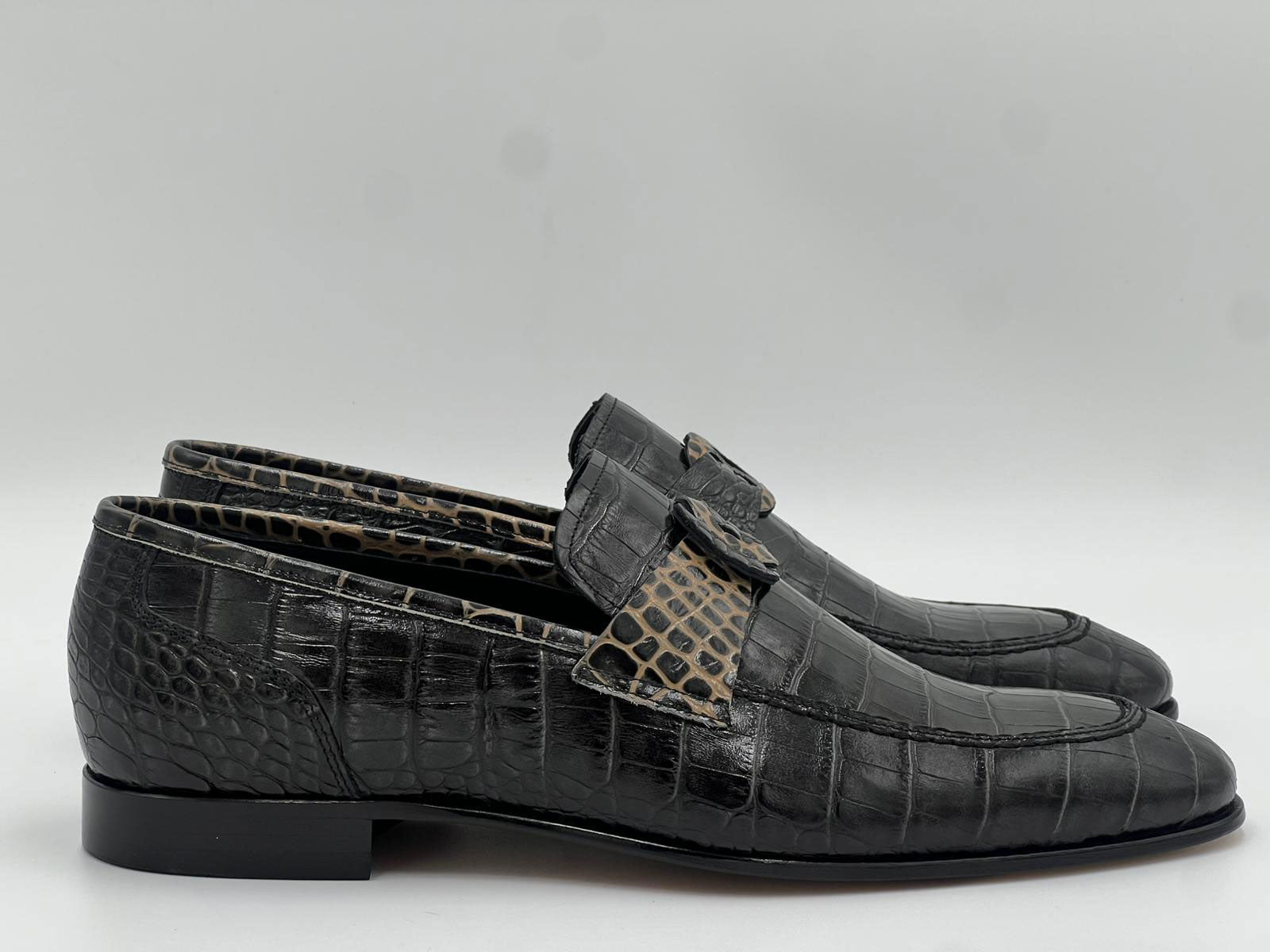 Spectacular Crocodile Embossed Leather slip-on Loafer from our C Collection features a Split-toe, Crocodile Embossed strap with Unique Buckle, a clean welt and a full Leather Sole!